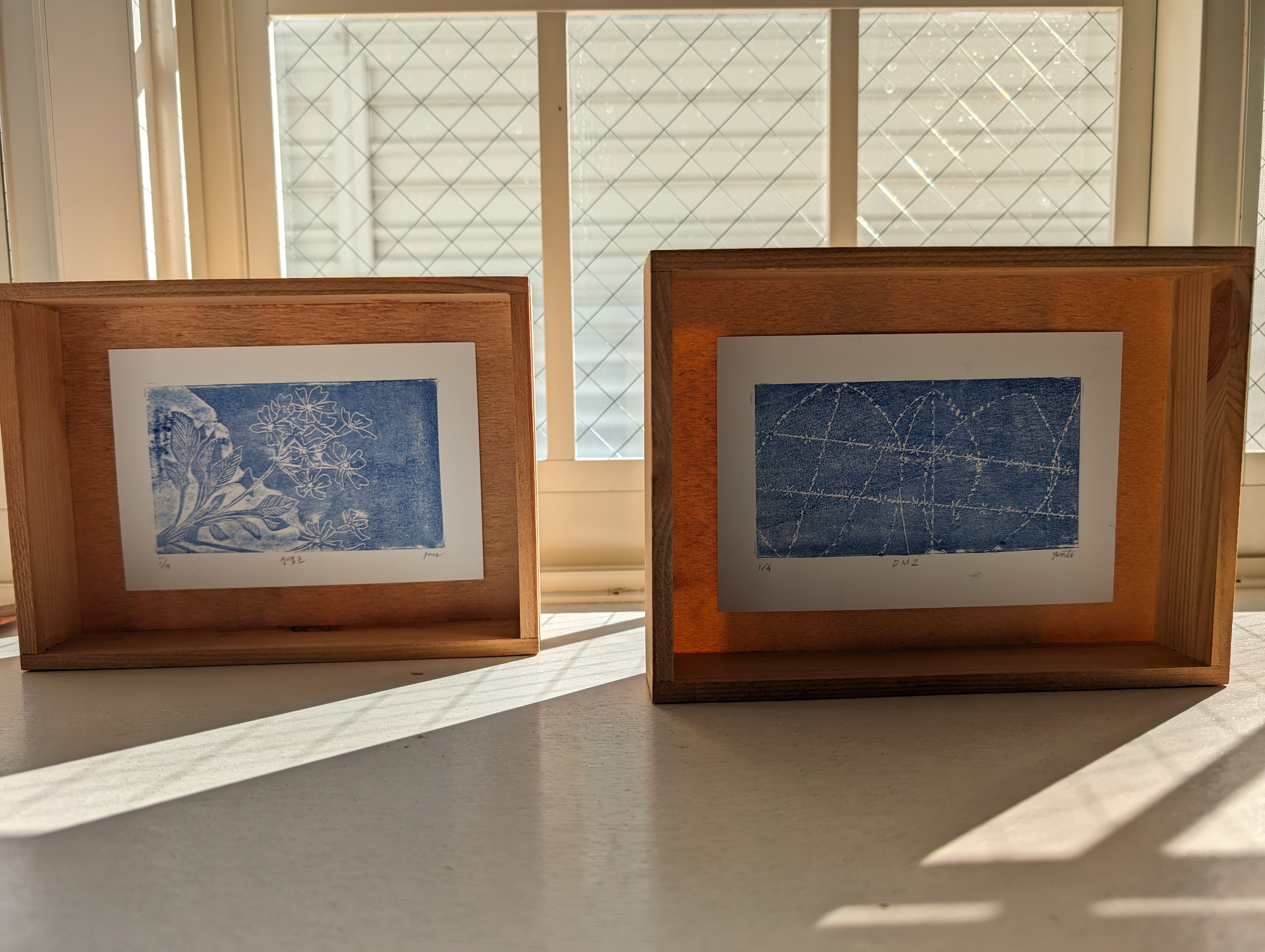 The artwork consists of two sets of edition prints, each presented in wooden box frames without glass or a front cover.