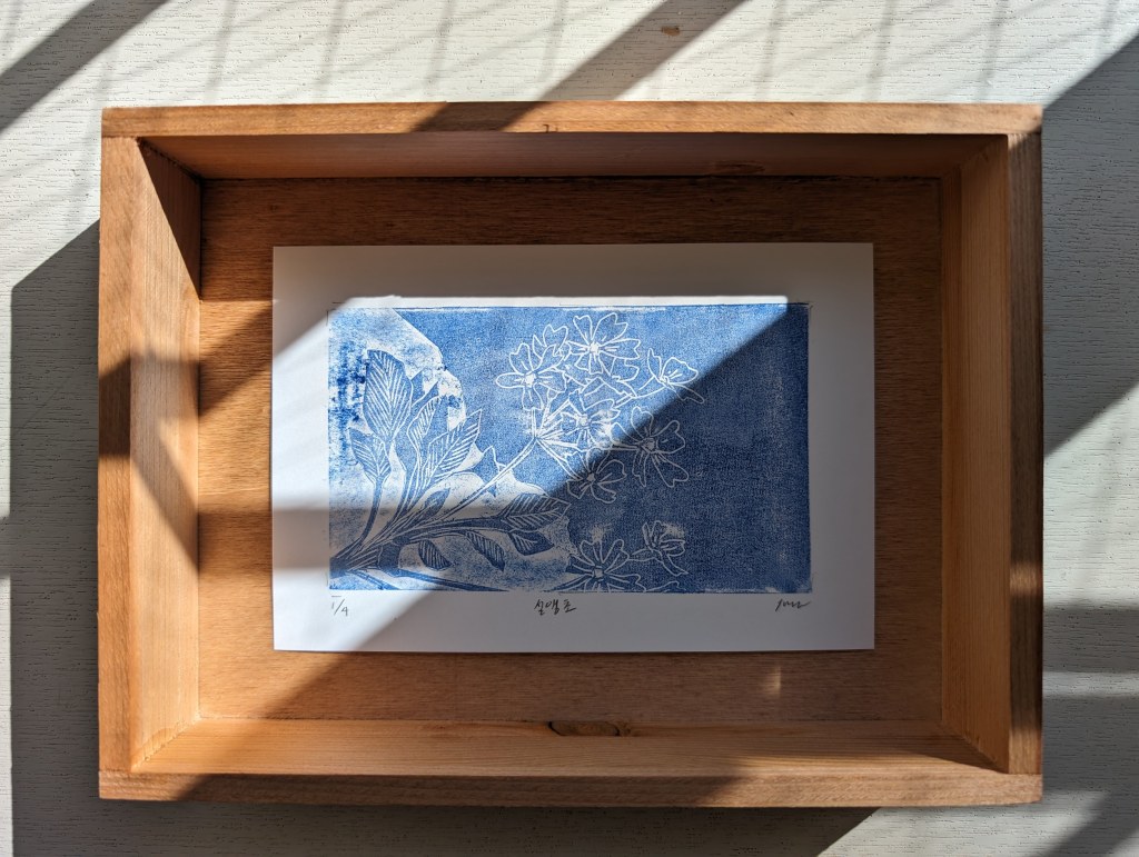 “Boundary” features prints made in an eco-friendly manner. The depicted image showcases an endangered plant (설앵초) within the Demilitarized Zone (DMZ) in Korea.