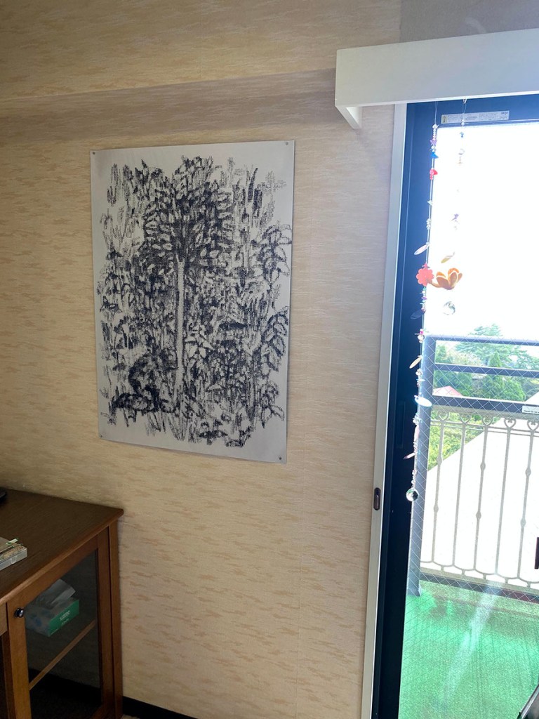 The tree behind the square window caught my eye. It was interesting to see the tree changing within the square as if it were growing every time I climbed the stairs. The trees that can be seen through the windows on each floor are put on the canvas as it is. In addition, animals and plants that can be found in Mt. Rokko were hidden one after another.