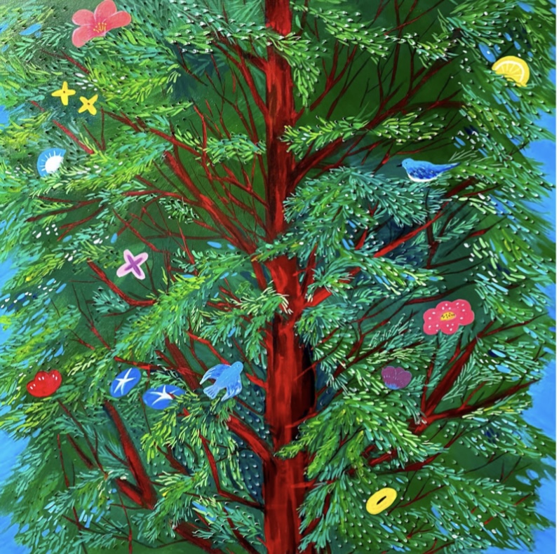 네모난 창문 뒤로 보이는 나무가 눈에 들어왔다. 계단을 오를 때마다 나무가 자라는 듯 정사각형 안에서 변화하는 나무의 모습이 흥미로웠다. 층층마다 창문을 통해 보이는 나무를 캔버스에 그대로 담았다. 그리고, 롯코산 속에서 만날 수 있을법한 동식물을 속속 숨겨두었다.