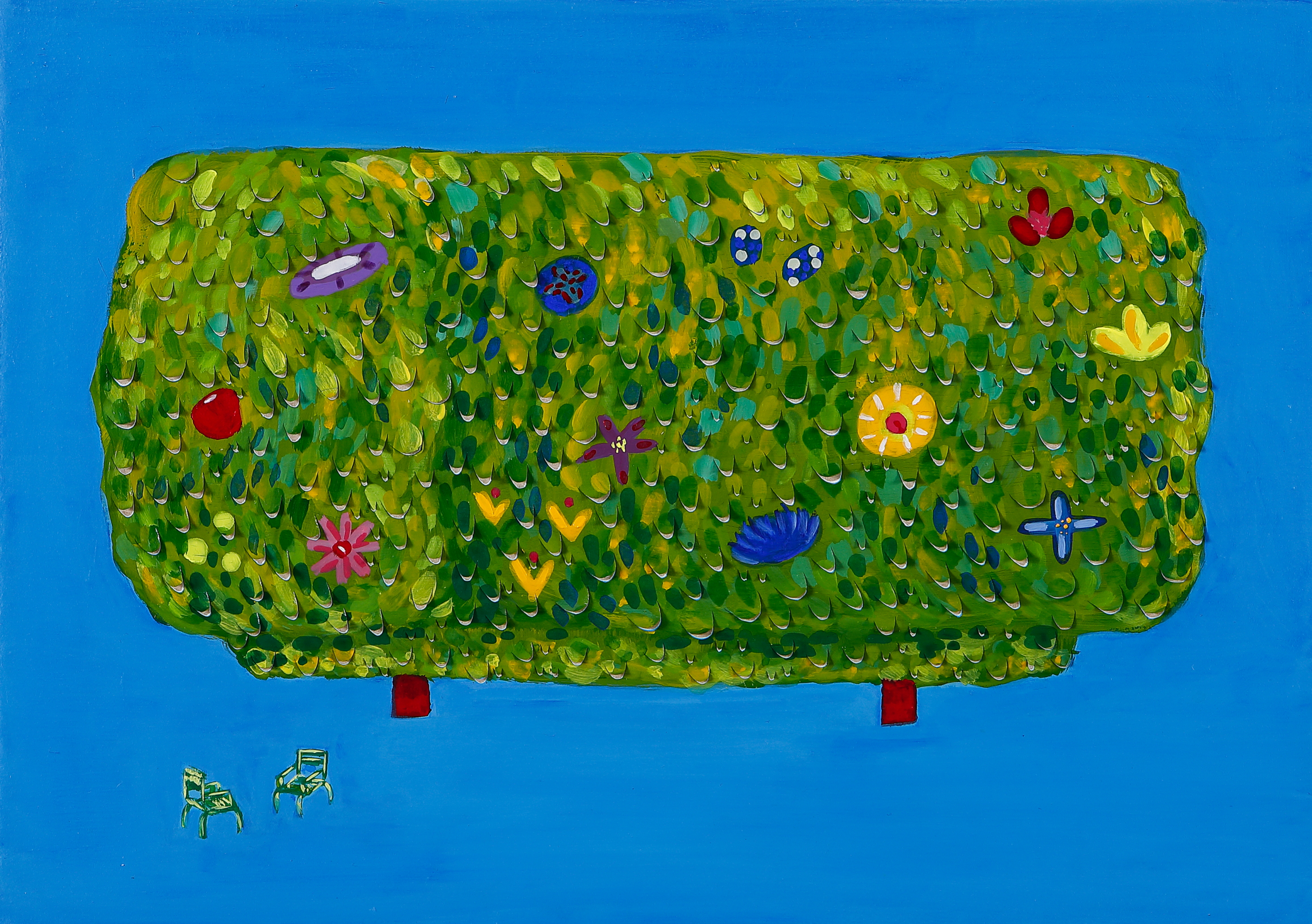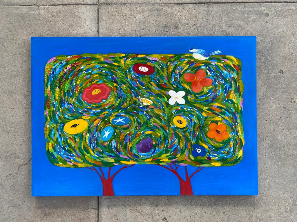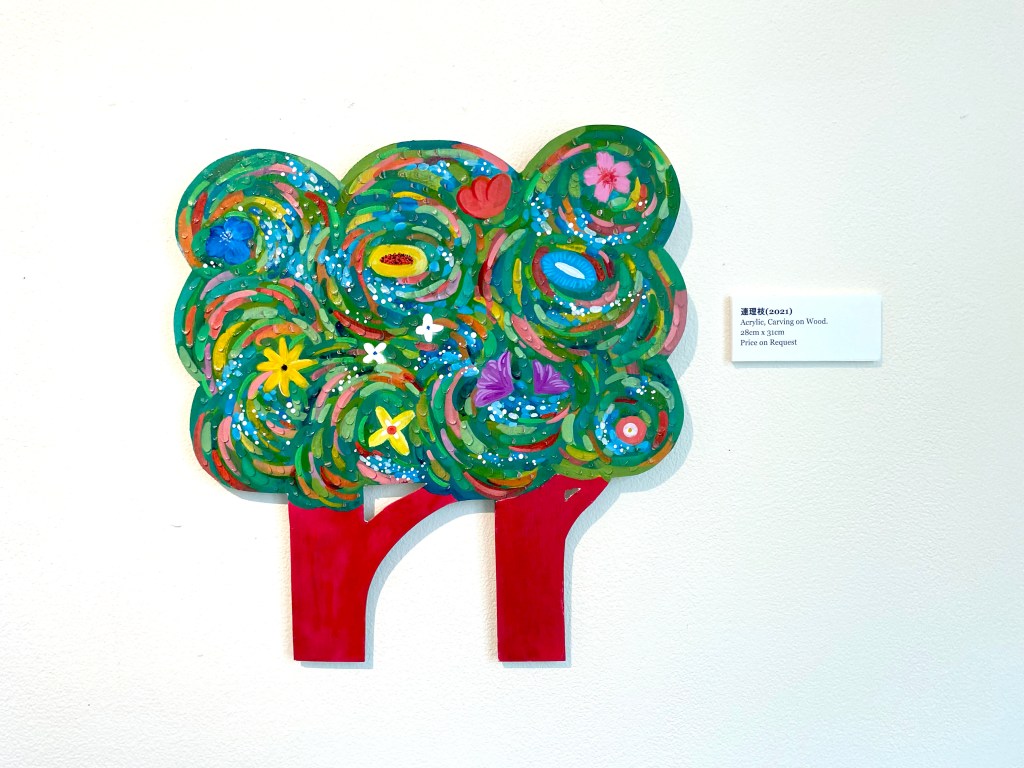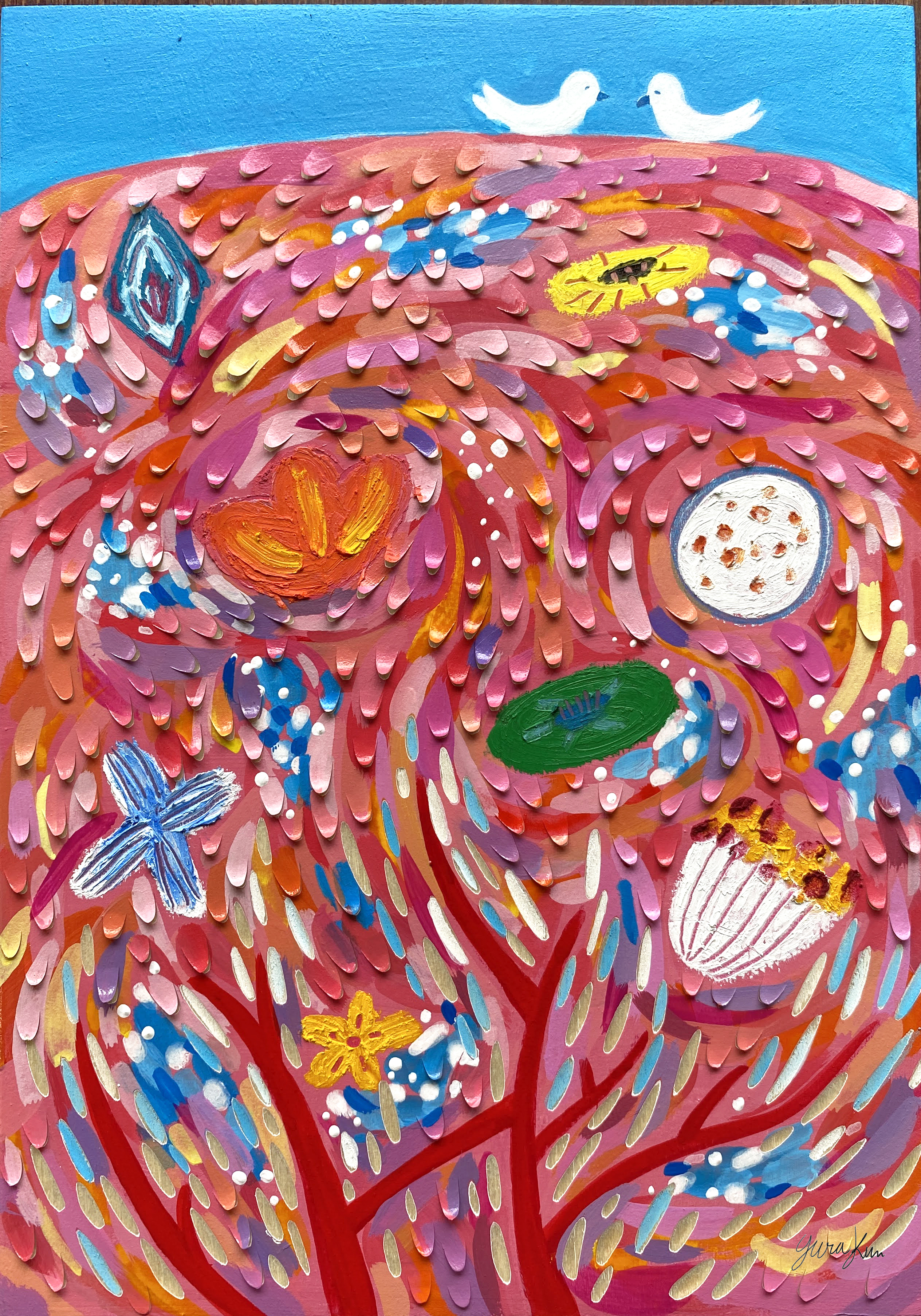 Using a wooden canvas and carving knife, I sculpted the painted surface to create a sense of movement, making the rounded ends resemble water droplets or leaves. The flowers among the green leaves varied in shape and color, reflecting an impossible harmony in nature. This symbolizes a society where diverse races, cultures, and personalities coexist and flourish together.