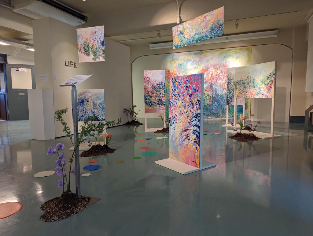 We live in a chaotic world with unprecedented typhoons, droughts, war, disease, and temperature abnormalities. Living in a rapidly changing and disappearing society, we often only see the things in front of us, judge quickly, and easily pass by all innumerable beautiful things. Shouldn't we make an effort to carefully revisit what we have overlooked, open our eyes, and see the world again?I have always been fascinated by nature, people, and ephemeral things. I have created works such as paintings, digital art, and installation art using various media to explore these topics. In this exhibition, not only have I created paintings and installations, but I have collaborated with performance artists and florists to explore various perspectives on the things we are missing.An extract from American poet and thinker Ralph Waldo Emerson's essay on "nature" served as inspiration for the exhibition's themes of wind, rain, and life.
